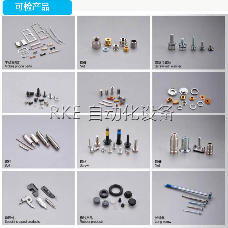 2、檢測的範圍:螺絲、螺母、汽車配件、手機零配件、航空件、塑膠件、磁芯產品、表麵缺陷、外觀尺寸、連接器、衝壓件、字符等等,都是可以進行檢測篩選的。